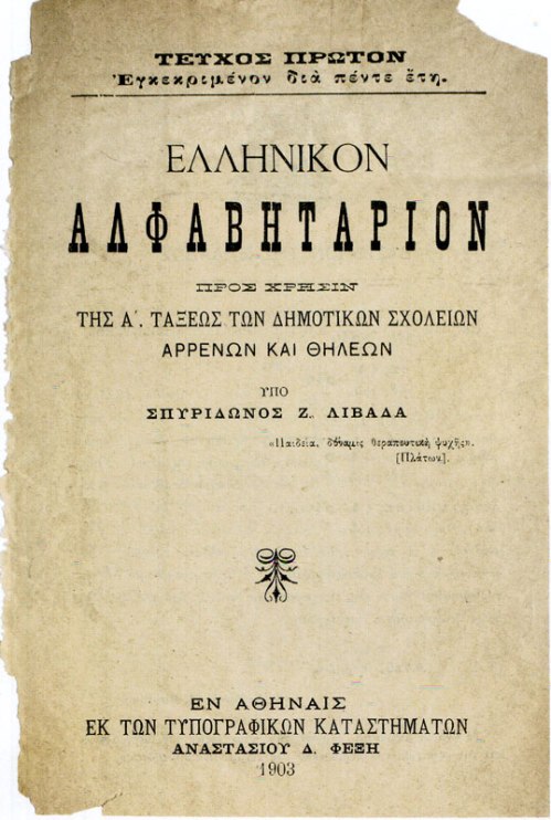 Σπυρίδωνος Ζ. Λιβαδά, Ελληνικόν αλφαβητάριον. Εκδοτικός οίκος Αναστασίου Δ. Φέξη, Αθήνα 1903