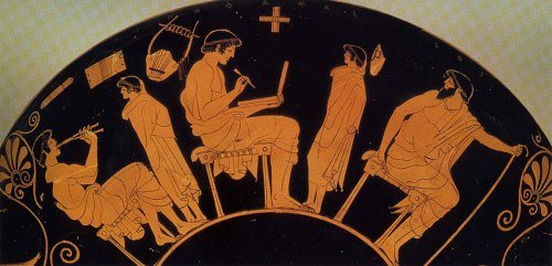 Σκηνή σχολείου Β΄, 490‐480 π.Χ., Αττική ερυθρόμορφη κύλικα του Δούρι. Ο Δούρις υπήρξε αρχαίος Έλληνας αγγειογράφος που άνθισε στις δύο πρώτες δεκαετίες του 5ου αιώνα π.Χ. Βερολίνο, Staatliche Museen Preussischer Kulturbesitz, Antikensammlung.