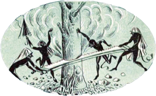 Οι καλικάντζαροι πριονίζουν το δένδρο της γης. Εικόνα από το Αναγνωστικό της Δ’ Δημοτικού, έκδοση ΟΕΔΒ, 1961.