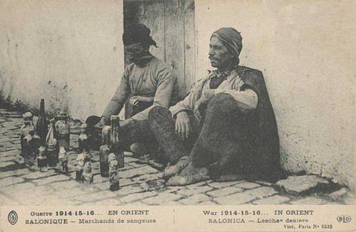 Θεσσαλονίκη, πωλητές βδελλών, 1914. Το επάγγελμα του αβδελά ξεκινάει τον 19ο αιώνα και η ακμή του φτάνει μέχρι το 1953-54.