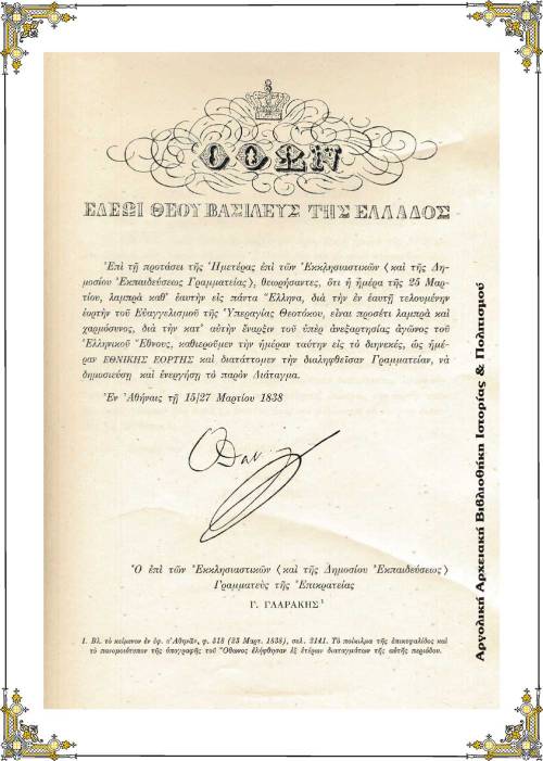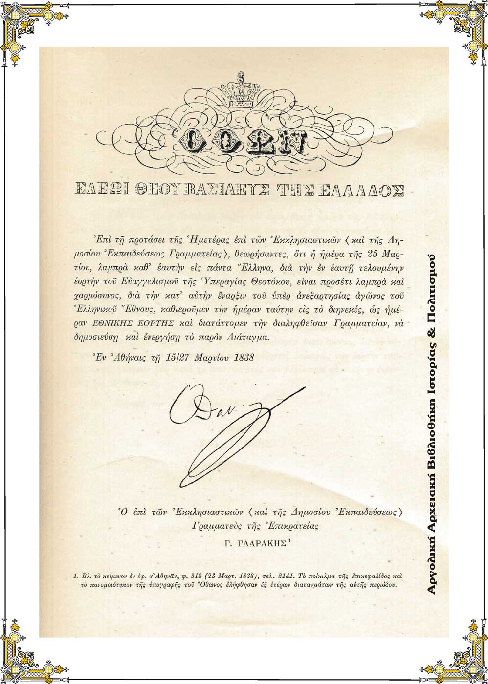 Διάταγμα για την καθιέρωση της 25ης Μαρτίου ως Εθνικής Εορτής.