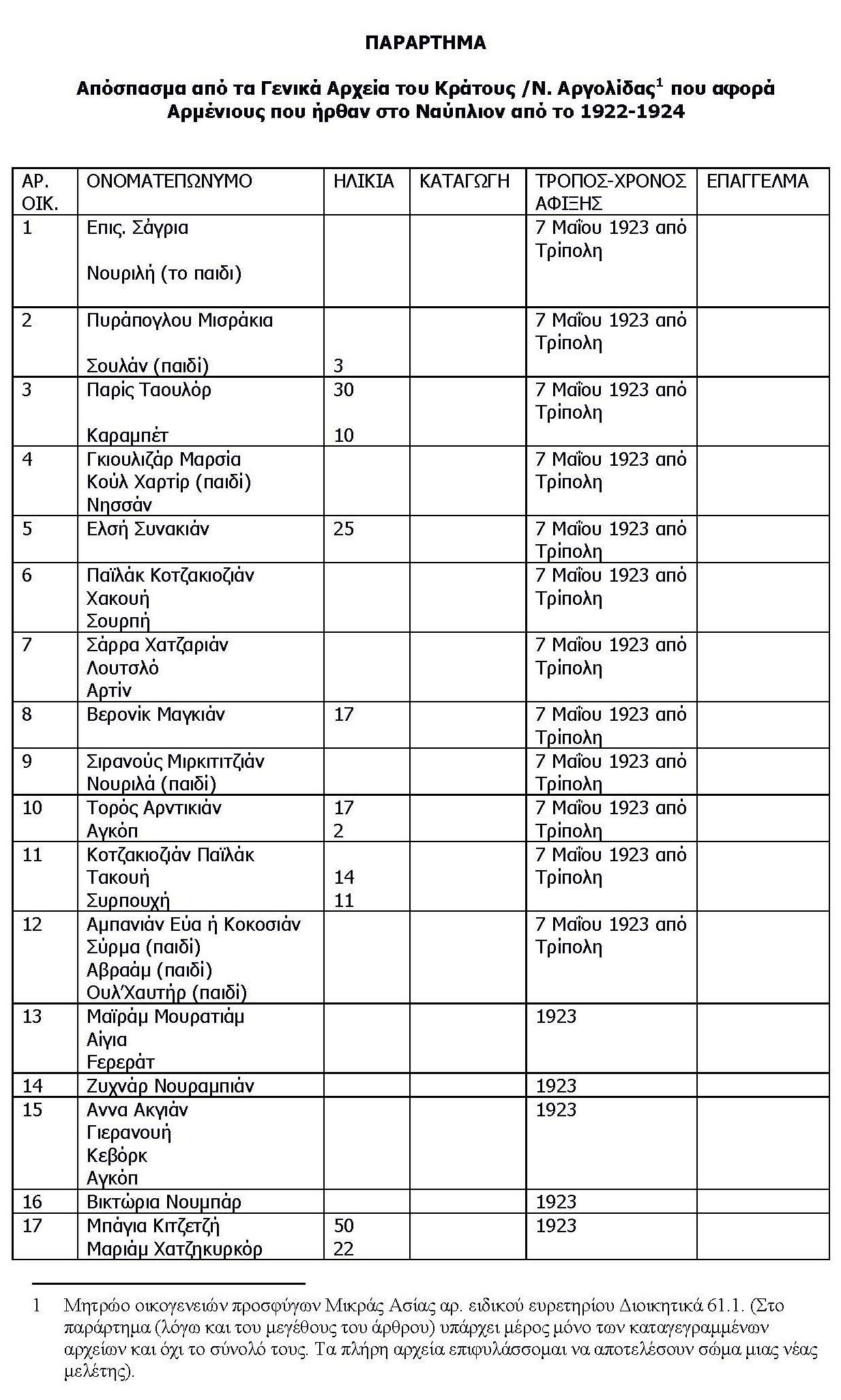 Η παρουσία και η επαγγελματική δραστηριοποίηση των Αρμενίων στο Ναύπλιον την πεντηκονταετία 1920-1970 » Παράρτημα 1