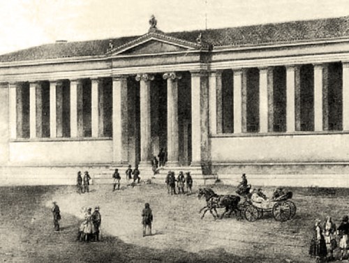 Γκραβούρα στην οποία απεικονίζεται το Πανεπιστήμιο Αθηνών, θεμελιωμένο το 1839. Ο Κουμανούδης ήταν ένας από τους πρώτους καθηγητές.