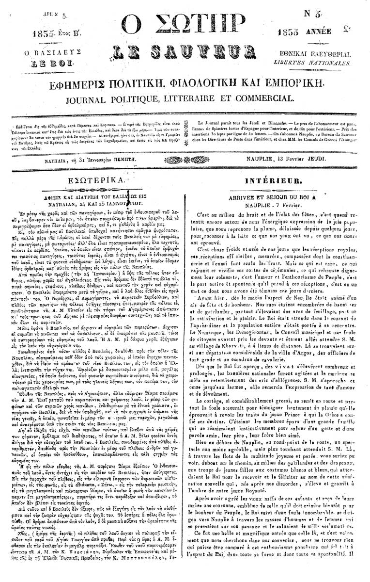 Ο «Σωτήρ, εφημερίς πολιτική, φιλολογική και εμπορική» του Ν.Σκούφου εκδιδόταν στο Ναύπλιο από τον Ιανουάριο του 1834 έως τον Μάρτιο του 1835, όταν και διέκοψε μετά τη δίκη στην οποία οδηγήθηκε ο συντάκτης του για προσβολή της Αρχής, εξαιτίας πολιτικού άρθρου. Επανεκδόθηκε στην Αθήνα μετά το 1838, με συντάκτη τον Π.Σκούφο, και διέκοψε οριστικά το ίδιο έτος. Διέθετε αντικυβερνητικό πνεύμα, έντονη επικριτική στάση προς την Αντιβασιλεία αλλά φιλοβασιλική διάθεση. Στο 5ο φύλλο, 31 Ιανουαρίου 1835, ο συντάκτης περιγράφει με γλαφυρό ύφος την επίσκεψη του Όθωνα στο Ναύπλιο για την επέτειο της αφίξεώς του στην Ελλάδα μετά από την πρόσκληση των ναυπλιακών αρχών.
