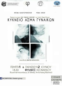 Η θεατρική ομάδα Incompatible theater group παρουσιάζει την παράσταση «Κύκνειο Άσμα Γυναικών», διασκευή του έργου «Δυο Γυναίκες Χορεύουν» του Ζουζέπ Μαρία Μπενέτ Ζουρνέτ διάρκειας 100 λεπτών. Την Πέμπτη 1 και την Παρασκευή 2 Ιουνίου 2017 στις Φυλακές Λεονάρδου. Κτήριο Λεονάρδου, Κωνσταντινουπόλεως & Εθνικής Αντίστασης, Ναύπλιο.