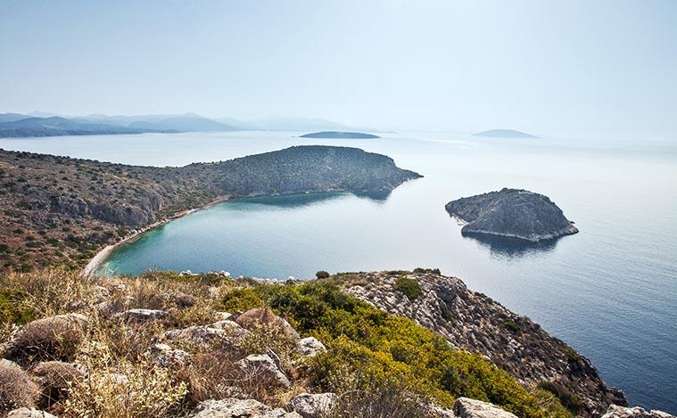 Το Δασκαλειό πίσω από το νησί Ρόμβη. Φωτογραφία από τον ιστότοπο του Τουριστικού Συνδέσμου Τολού.