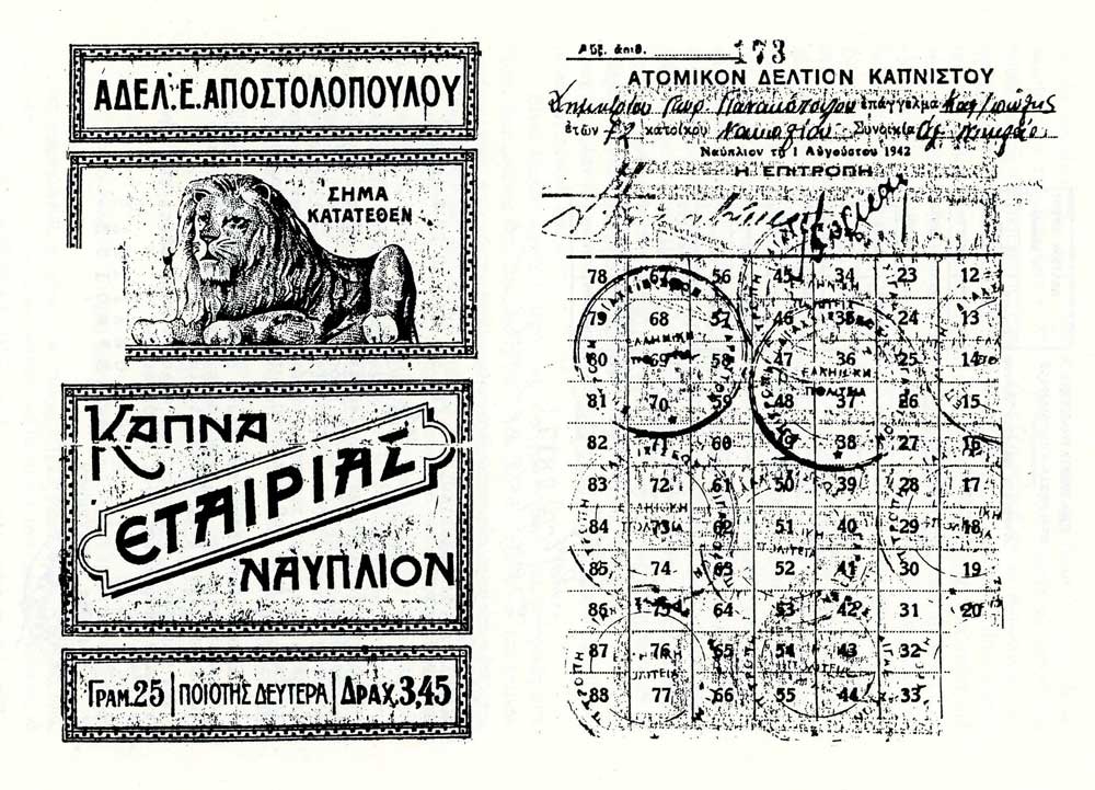 Ειδικό δελτίο διανομής τσιγάρων. Κατά την Κατοχή οργίαζε η μαύρη αγορά των τσιγάρων. Κυκλοφορούσαν μόνο κάτι φτηνά τσιγάρα σε κούτες, «στούκας» τα είχαν παρονομάσει, βαριά, πού κατέστρεφαν πνεύμονες, και, μόνον οι θεριακλήδες λυσσούσαν να τα βρουν. Και για την προμήθεια τους είχε εφαρμοστή ειδικό δελτίο διανομής. Στο Ναύπλιο τυπώθηκαν τον Αύγουστο «ατομικά δελτία καπνιστού», δεν υπήρχε μάλιστα κατάλληλο χαρτί εκτυπώσεως και ο μακαρίτης Κων. Αποστολόπουλος, πατέρας του αξέχαστου Θύμιου, ο όποιος είχε προπολεμικά συνεταιρική με τον αδελφό του βιοτεχνία σιγαρέτων, παρεχώρησε παλαιό, της πρώτης περιόδου της δραστηριότητας των, αχρησιμοποίητα κουτιά, τα όποια τυπώθηκαν στην πίσω λευκή πλευρά.