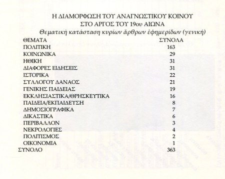 - Η εξέταση των εφημερίδων μας βοηθά, ίσως για πρώτη φορά, να στοιχειοθετήσουμε μια ποσοτική ανάλυση για την εποχή εκείνη. Θα παρουσιάσω στο σημείο αυτό, τους σημαντικότερους στατιστικούς πίνακες της έρευνας αυτής.