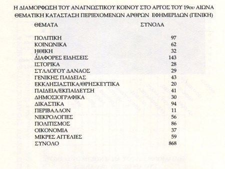 Το αναγνωστικό κοινό διαμορφώνεται κυρίως συνδρομητικά την πρώτη αυτή περίοδο του νεοελληνικού κράτους. Δεν είναι τυχαίο ότι οι πρώτες εκδόσεις έχουν απαραίτητα και τον κατάλογο των ονομάτων των συνδρομητών οι οποίοι δεν προέρχονται υποχρεωτικά από την ίδια πόλη. Είναι όμως σημαντικό ότι μοιράζονται την ίδια ευαισθησία και ως μέλη του ίδιου αναγνωστικού κοινού.