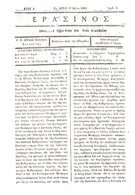 - ΕΡΑΣΙΝΟΣ: Εφημερίς Πολιτική και των Ειδήσεων, 1885, φ. 1-15, (2-5-1885 έως 11-9-1885).