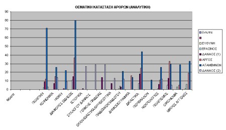 Στους πίνακες αυτούς βλέπουμε μια αποτύπωση των περιεχόμενων άρθρων στην οποία και πάλι οι κατηγορίες της «Πολιτικής» και των «Διαφόρων Ειδήσεων» είναι οι σημαντικότερες. Θα σημειώσω πως στη δεύτερη κατηγορία περιέχονται και πάλι πολιτικές ειδήσεις ή ανακοινώσεις πολιτικών προσώπων, όχι όμως αποκλειστικά διότι περιλαμβάνονται και άλλες γενικότερου ενδιαφέροντος. Αποτελεί όμως τη σημαντικότερη στήλη με ένα ποσοστό 16,5% επί του συνόλου των άρθρων και ακολουθούν οι κατηγορίες «Πολιτική» (11,2%), «Δικαστικά» (10,8%) και «Πολιτισμός» (9,9%). Η τάση αυτή επιβεβαιώνεται σε όλες τις εφημερίδες με εξαίρεση το ΔΑΝΑΟ (2), ο οποίος διαμοιράζει τις ειδήσεις καθημερινότητας σε άλλες στήλες. Επειδή δε, δεν υπάρχει καθημερινή έκδοση εφημερίδας η κατηγορία «Διάφορα» προσδιορίζεται κυρίως ως «ειδήσεις καθημερινότητας».