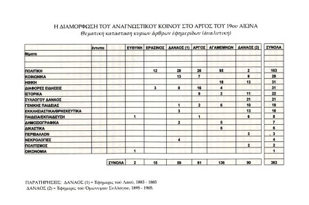 Όμως, συγκριτικά με το χαρακτήρα αυτό του πληθυσμού, ο αριθμός των εντύπων και των εφημερίδων που κυκλοφορούν είναι σημαντικός. Οι πληροφορίες που σώζονται αποτυπώνουν μια σημαντική εκδοτική δραστηριότητα εφημερίδων, την τελευταία περίπου 20ετία του 19ου αιώνα, δηλαδή, από το 1883 και μετά (Πίνακας 2). Η πρώτη έκδοση εφημερίδας είναι τα δυο μόνο φύλλα της ΕΥΘΥΝΗΣ (η έκδοση γίνεται πρώτα στο Ναύπλιο, άρα τα δυο μόνο φύλλα αφορούν την έκδοση που συνεχίζεται στο Άργος), ενώ την ίδια χρονιά ξεκινά και ο «ΔΑΝΑΟΣ» του Ιωαν. Υψηλάντη του οποίου η έκδοση θα διατηρηθεί μέχρι και το 1885 για να παραχωρήσει τον τίτλο του στην εφημερίδα που θα εκδώσει ο ομώνυμος Σύλλογος. Το 1885 αρχίζει την έκδοσή του ο «ΕΡΑΣΙΝΟΣ» και την ίδια χρονιά το «ΑΡΓΟΣ» το οποίο διατηρείται μέχρι το 1889. Η εφημερίδα «ΑΓΑΜΕΜΝΩΝ» αρχίζει την έκδοσή της το 1888 μέχρι και το 1899 και γίνεται έτσι το μακροβιότερο έντυπο του Άργους. Τέλος, ο Σύλλογος Αργείων «Ο Δαναός», αρχίζει τη δική του έκδοση με τον ίδιο τίτλο που παραχωρεί με επιστολή του στις 6-12-1895 ο Ι. Υψηλάντης. Τέλος, μαθαίνουμε την πιθανή έκδοση της εφημερίδας «Τα Νέα του Άργους» από κριτική του ΔΑΝΑΟΥ στις 7-10-1896, αλλά δεν γνωρίζουμε αν τελικά εκδόθηκε. Ας σημειωθεί, πως μεγάλες μορφές της τοπικής ιστορίας θα ασχοληθούν με τις εκδόσεις αυτές, όπως ο ιστορικός Δ. Βαρδουνιώτης (Αργολίς Ναυπλίου, Άργος).