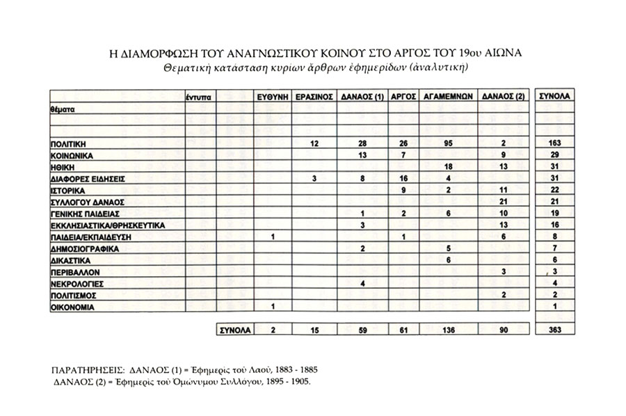 Στην «αναστατική» έκδοση με τίτλο «Αργολικόν Ημερολόγιον 1910, Εκδιδόμενον υπό του εν Αθήναις Συλλόγου των Αργείων» και τυπωμένο «Εν Αθήναις – Εκ του τυπογραφείου των Καταστημάτων Δημ. Τερζόπουλου – 1910», συναντάμε σημαντικούς λόγιους του 19ου αιώνα του Άργους αλλά και του γειτονικού Ναυπλίου, όπως ο Ιωάννης Κοφινιώτης, ο Δημήτριος Βαρδουνιώτης, ο Μιχαήλ Λαμπρυνίδης, ο Ιερέας και ιδρυτής του Συλλόγου «Ο Δαναός» Χρήστος Παπαοικονόμος και άλλους πολλούς, που οι εργασίες τους φιλοξενούνται στις 356 κιτρινισμένες και φθαρμένες από το χρόνο σελίδες του βιβλίου.