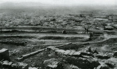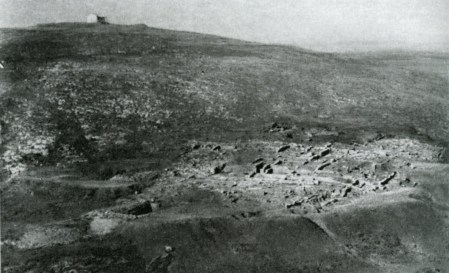 Κατ’ αντίθετη φορά, άποψη του γυμνού λόφου της Ασπίδας, με το εκκλησάκι του Άη-λιά στην κορυφή (φωτ. του W. Vollgraff, από Le sanctuaire d’ Apollon Pythéen à Argos ÉtPélop 1 [1956], σ. 10, εικ. 4, και με την υπόμνηση «συνολική άποψη του τόπου των ανασκαφών».