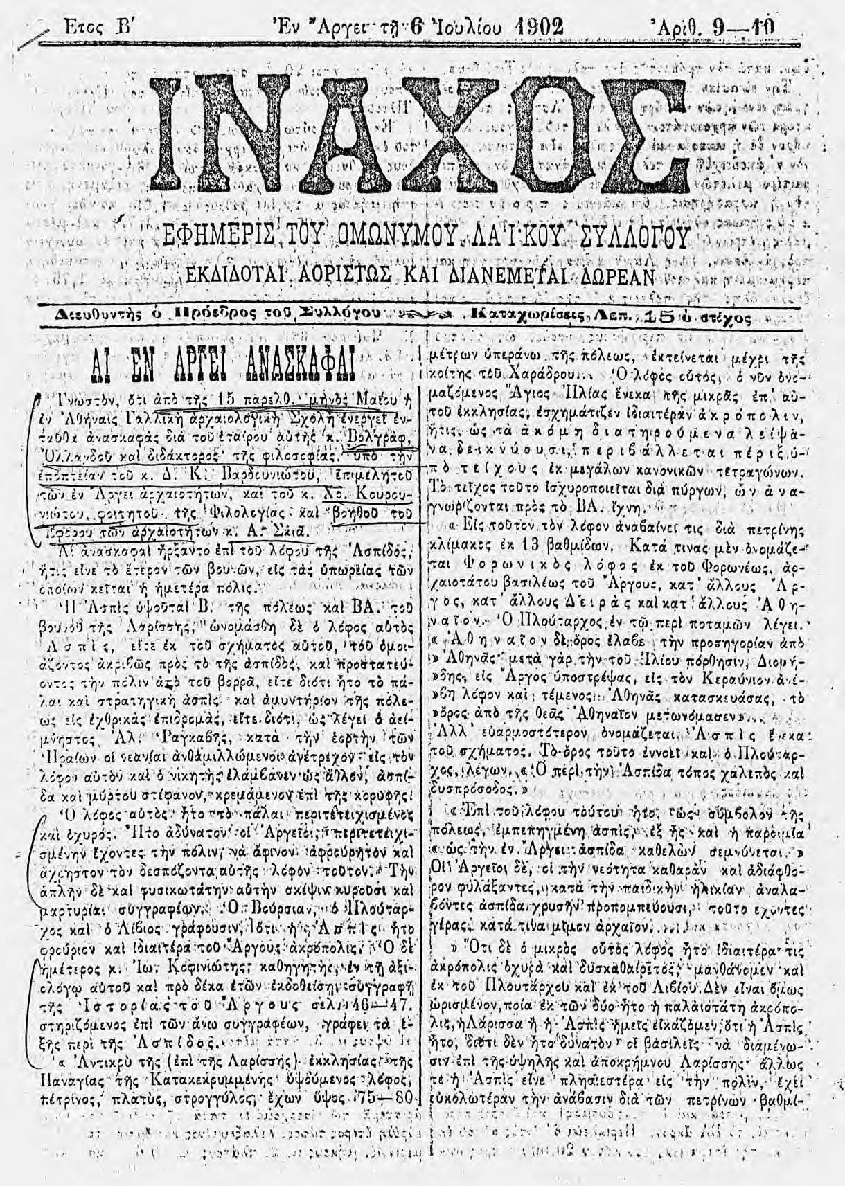 Δημοσιεύεται τρισέλιδο εμπεριστατωμένο άρθρο, προφανώς του ίδιου του Βαρδουνιώτη, ξεκινώντας από την πρώτη σελίδα. Πλήρως βιβλιογραφικά τεκμηριωμένο, το άρθρο αυτό πληροφορεί για πρώτη φορά ότι οι ανασκαφές του Vollgraff γίνονται υπό την εποπτεία του Βαρδουνιώτη, επιμελητή των αρχαιοτήτων στο Άργος, και του Χρ. Κουρουνιώτη, φοιτητή της φιλολογίας, με βοηθό τον Έφορο Αρχαιοτήτων Α. Σκιά.