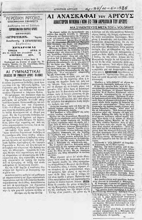 Συνέντευξη του W. Vollgraff στην τοπική εφημερίδα «Αγροτική Αργολίς» της 10-6-1928.