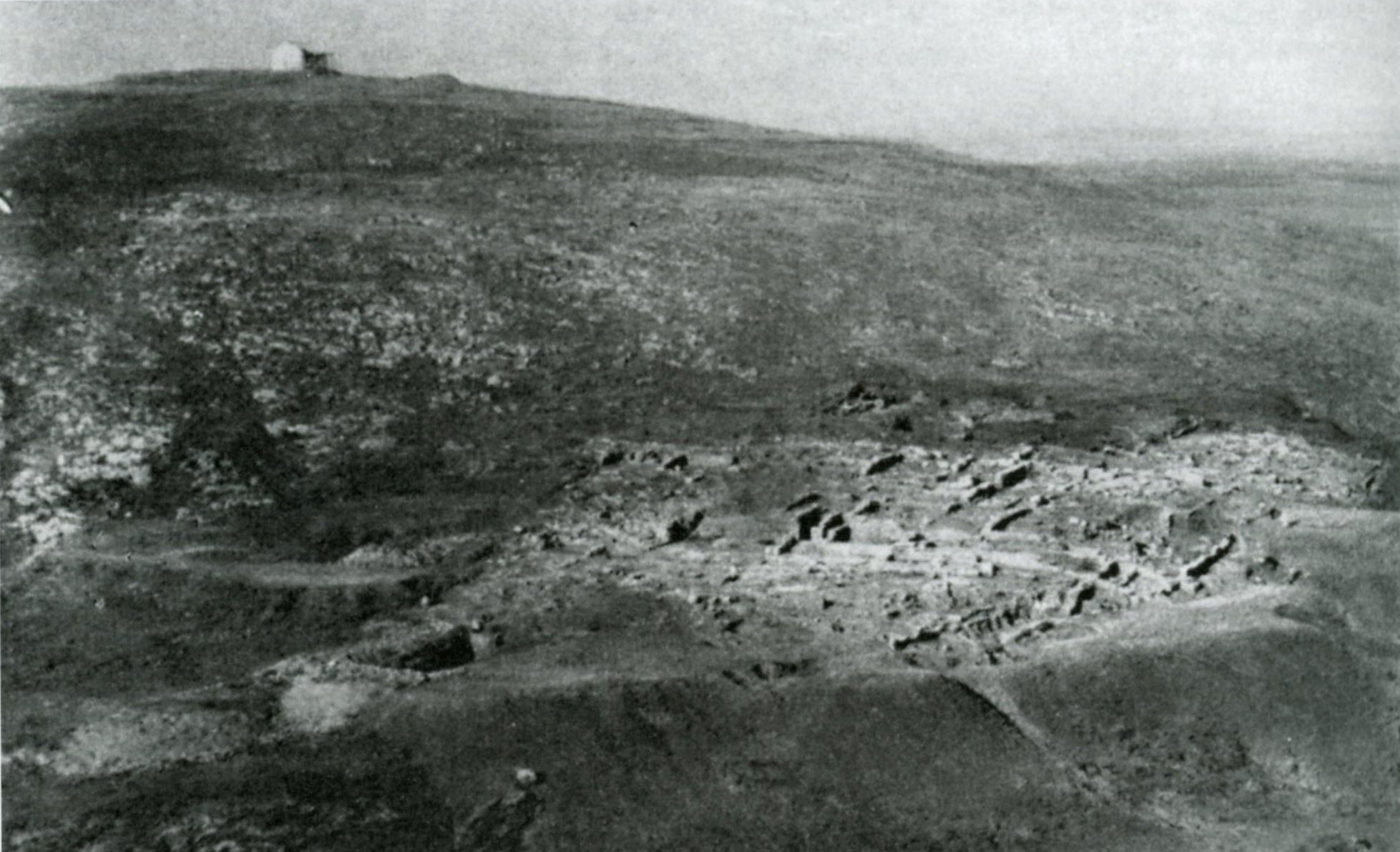 Κατ’ αντίθετη φορά, άποψη του γυμνού λόγου της Ασπίδας, με το εκκλησάκι του Άη-λιά στην κορυφή (φωτ. του W. Vollgraff, από Le sanctuaire d’ Apollon Pythéen à Argos ÉtPélop 1 [1956], σ. 10, εικ. 4, και με την υπόμνηση «συνολική άποψη του τόπου των ανασκαφών».