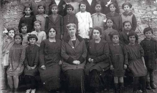 Μαθήτριες του 3/τάξιου Δημοτικού, περίπου στο 1922, με τις δασκάλες τους Πόπη Ζησιάδου, Μαρία Νικολέτου και Μαρίκα Μπακούρου – Παπαμιχαήλ (από το αρχείο του Ι.Λ.Μ.Ε.).