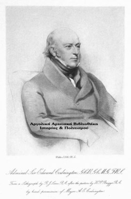 Sir Edward Codrington. Ο ναύαρχος του Βρετανικού στόλου Έντουαρντ Κόδριγκτον, ήρωας της ναυμαχίας του Τραφάλγκαρ και της ναυμαχίας του Ναβαρίνου. Λιθογραφία, δημοσιεύεται στο βιβλίο, «The royal navy, a history from the earliest times to the present (1897)» σελ. 148.