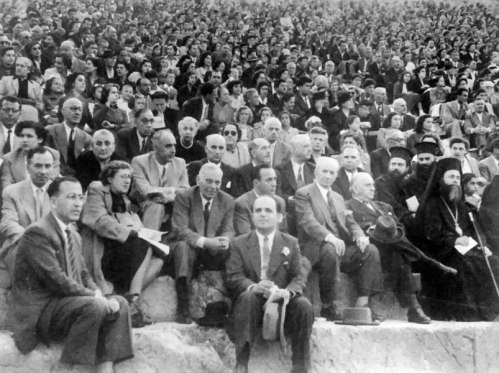 Αρχαίο θέατρο Άργους. Θεατρική παράσταση «Παλαμήδης», 3 & 4 Μαΐου 1952. Εμπρός δεξιά ο Θεόδωρος Κωστούρος, πίσω αριστερά η Ελένη Ουράνη κριτικός λογοτεχνίας, θεάτρου και συγγραφέας, γνωστή με το ψευδώνυμο Άλκης Θρύλος.