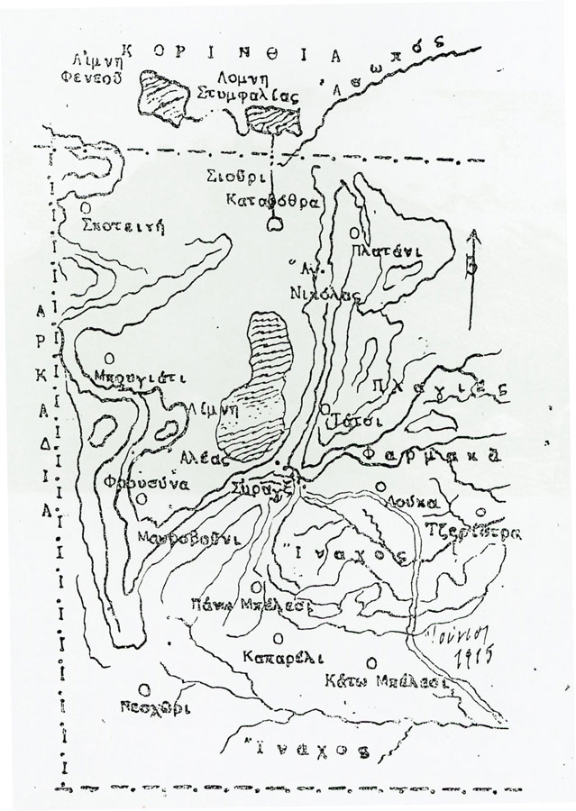Τα ορεινά χωριά του Άργους, από τα οποία μετανάστευσαν πολλοί Αργείοι (χειρόγραφος χάρτης του 1915).