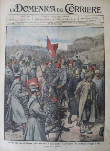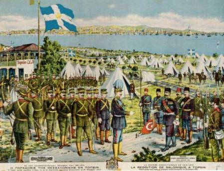 Η τελετή παράδοσης των Ιωαννίνων. Λαϊκή εικόνα εποχής. Η μάχη των Γιαννιτσών ήταν μια από τις σημαντικότερες του Α’ Βαλκανικού Πολέμου. Ξεκίνησε στις 19 Οκτωβρίου 1912 με τον Ελληνικό Στρατό να επιτίθεται από τα δυτικά κατά των Τουρκικών δυνάμεων στα Γιαννιτσά και μετά από διήμερο σκληρό αγώνα να αναδεικνύεται νικητής.
