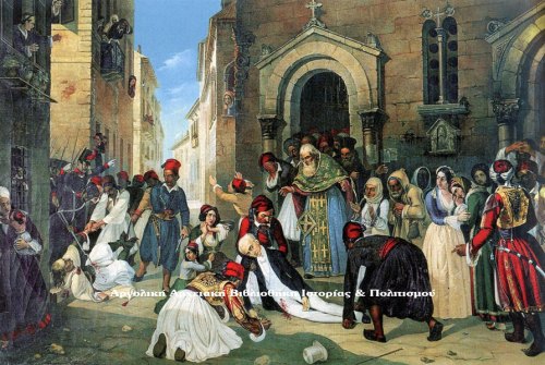 Η δολοφονία του Ιωάννη Καποδίστρια. Διονύσιος Τσόκος, 1850, Λάδι σε καμβά. Ελληνική Κοινότητα Τεργέστης.