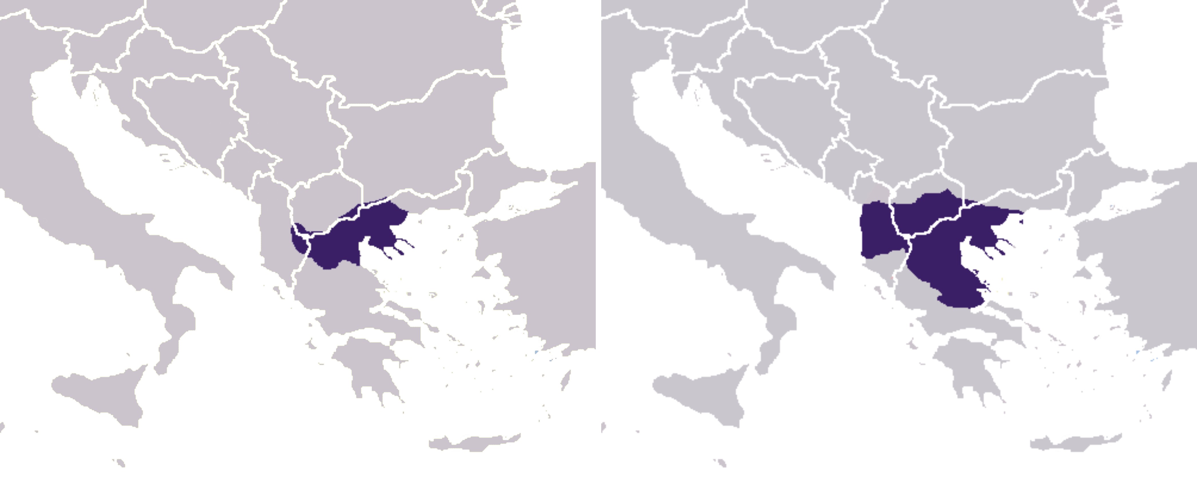 Το αρχαιοελληνικό μακεδονικό βασίλειο (αριστερά) και η Ρωμαϊκή επαρχία της Μακεδονίας (δεξιά). Όρια κατά προσέγγιση. Πηγή: Βικιπαίδεια.