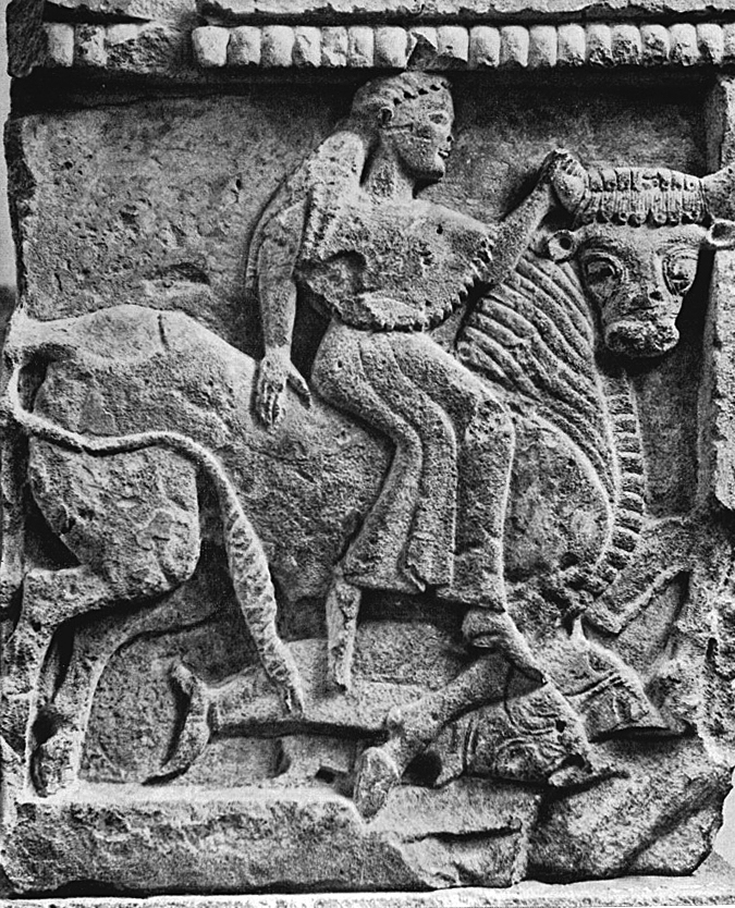 Αρπαγή της Ευρώπης. Μετόπη από τον ναό της Ήρας στον Σελινούντα, 6ος αι. π.Χ. Παλέρμο, Εθνικό Αρχαιολογικό Μουσείο.