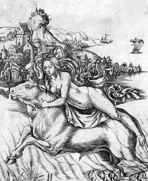 Αρπαγή της Ευρώπης. Palumba, Giovanni Battista, 1500-1510, χαρακτικό Λονδίνο, Βρετανικό Μουσείο, 1869.