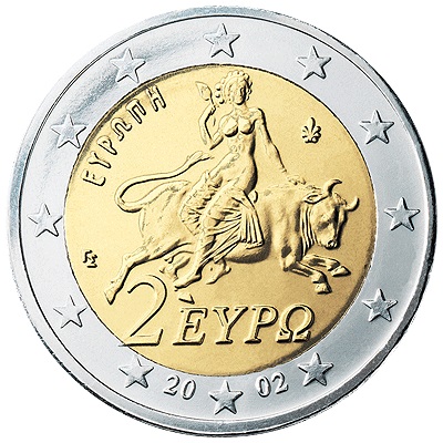 Η αρπαγή της Ευρώπης απεικονίζεται στο κέρμα των 2 ευρώ. Η αρπαγή της πριγκίπισσας Ευρώπης από τη Φοινίκη της Ασίας από το Δία που την ερωτεύτηκε κεραυνοβόλα και την άρπαξε παίρνοντας μορφή ταύρου. Καρπός του έρωτα ήταν ο Μίνωας στην Κρήτη.