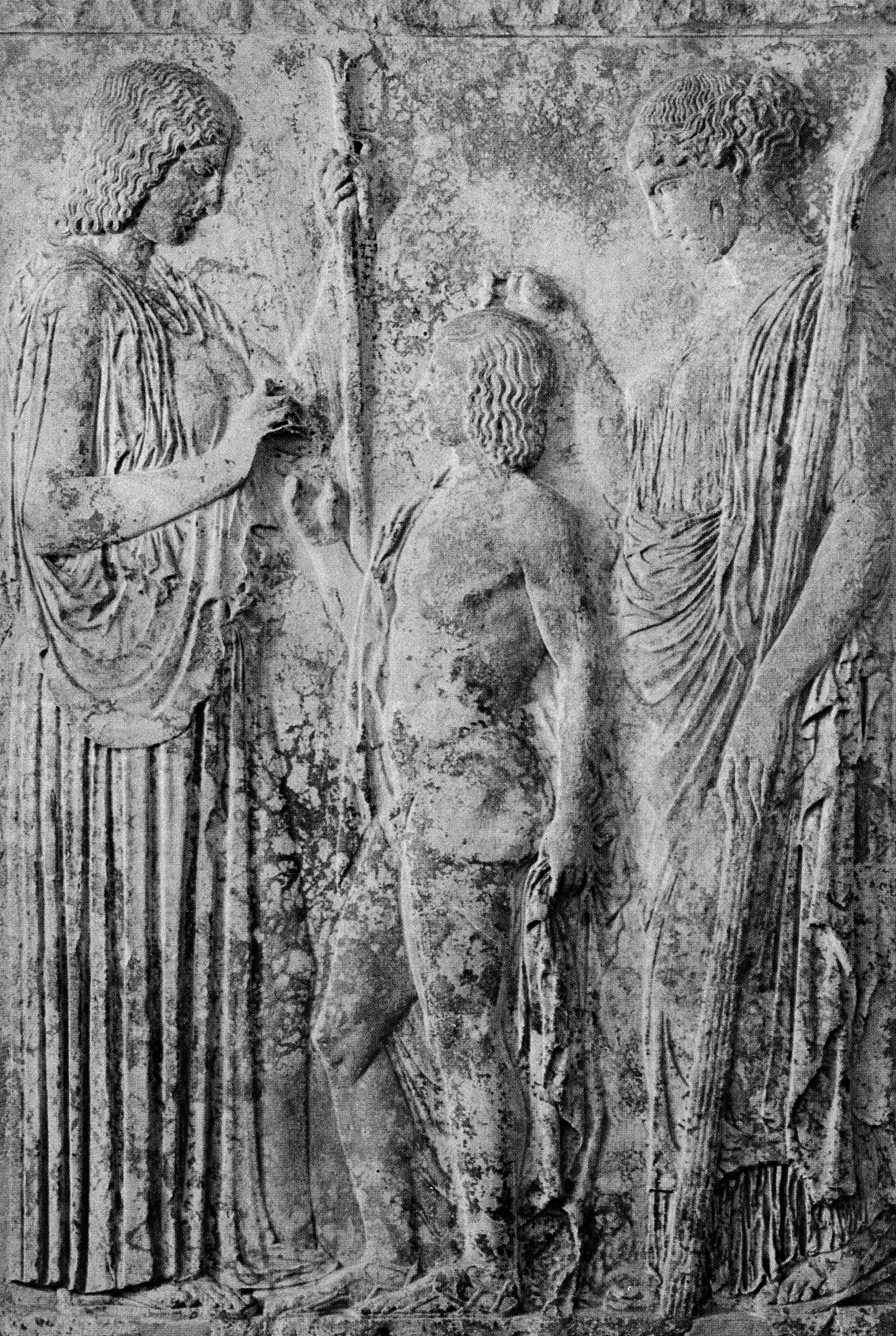 Οι θεές της Ελευσίνας Δήμητρα και Περσεφόνη εικονίζονται σε μυστηριακή τελετή. Η Δήμητρα αριστερά παραδίδει στον νέο Τριπτόλεμο στάχυα για να διαδώσει την καλλιέργειά τους στον κόσμο. Δεξιά η Περσεφόνη. Ανάγλυφο. Γύρω στα 440 – 430 π. Χ. Αθήνα, Εθνικό Αρχαιολογικό Μουσείο.