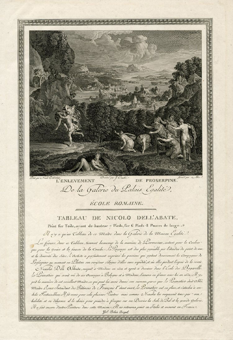 The rape of Proserpine, she is being carried away by Pluto at left, a deep landscape in the background, after Niccolò dell’ Abbate. British Museum.