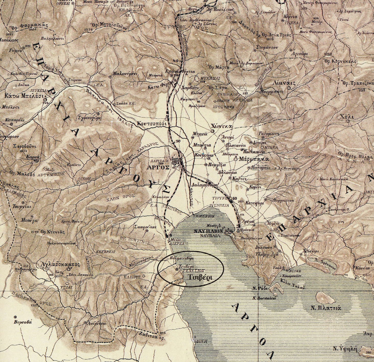 Τμήμα χάρτη της Αργολιδοκορινθίας του Αντώνη Μηλιαράκη,1886.
