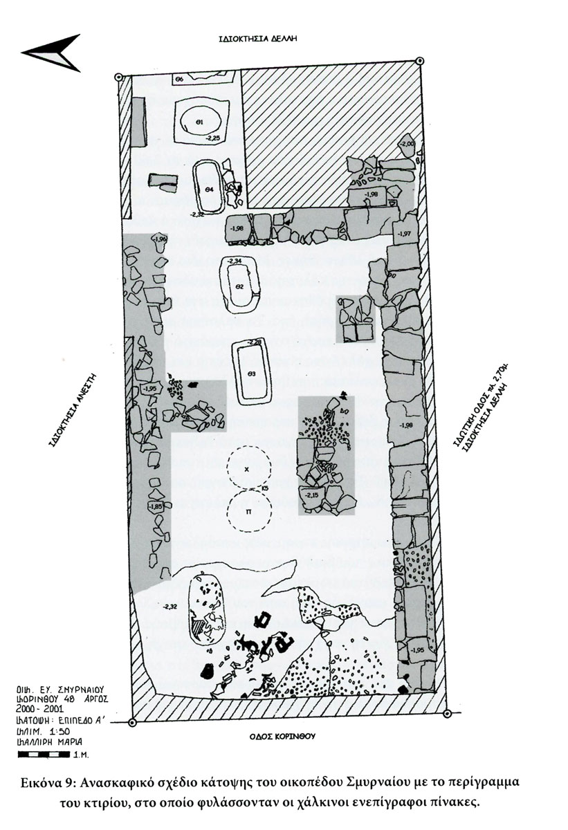 Εικόνα 9: Ανασκαφικό σχέδιο κάτοψης του οικοπέδου Σμυρναίου με το περίγραμμα του κτιρίου, στο οποίο φυλάσσονταν οι χάλκινοι ενεπίγραφοι πίνακες.