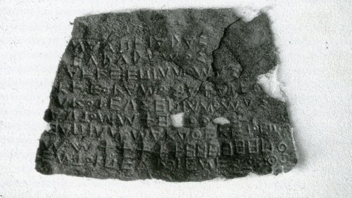 Η πίσω πλευρά του πίνακα ΟΜ 160, που δείχνει τον τρόπο χάραξης των γραμμάτων με την έκκρουστη τεχνική, από τα δεξιά προς τα αριστερά.