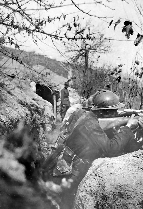 Έλληνες σε χαράκωμα της Μακεδονίας. Φωτογραφία από το αρχείο του στρατηγού Αλεξάνδρου Μαζαράκη-Αινιάνα. (Εθνικό Ιστορικό Μουσείο).