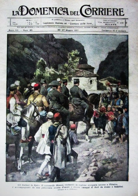 Εξώφυλλο της εφημερίδας «Domenica del Corriere», 20 – 27 Μαΐου 1917. Κάτω από την φωτογραφία αναγράφει: «Οι Ιταλοί στην Ήπειρο. Ο συνταγματάρχης Brussi, επισκεπτόμενος την περιοχή γύρω από τους Φιλιάτες, συνοδεύεται από γραφική τιμητική συνοδεία και δέχεται δώρο λουλούδια από γυναίκες και παιδιά». Η προσπάθεια να παρουσιαστεί ως ευπρόσδεκτη η ιταλική άφιξη στην Ήπειρο είναι εμφανής.