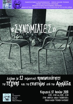 «Συνομιλίες» με 12 σημαντικές προσωπικότητες της τέχνης και της επιστήμης από την Αργολίδα – Κυριακή 17 Ιουνίου 2018, αίθουσα «Λήδα Τασοπούλου», Σχολή Καλών Τεχνών, Πανεπιστήμιο Πελοποννήσου, Ναύπλιο.
