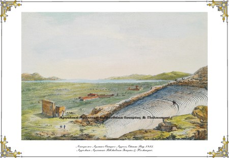 Άποψη του Αρχαίου Θεάτρου του Άργους όπου διεξάγονταν οι εργασίες της Δ’ Εθνικής Συνελεύσεως. Επιχρωματισμένη λιθογραφία, Rey Étienne, 1843