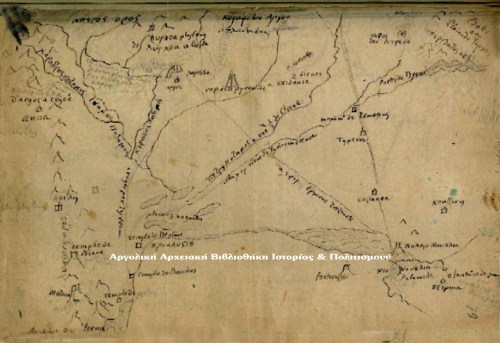 Η πεδιάδα του Άργους με καταγεγραμμένες τις πόλεις και τα χωριά. Ο Fourmont έψαχνε αρχαιότητες και ελληνικά χειρόγραφα για να τα μεταφέρει στη βιβλιοθήκη των ανακτόρων. Στο κέντρο τοποθετεί την πυραμίδα του Ελληνικού.