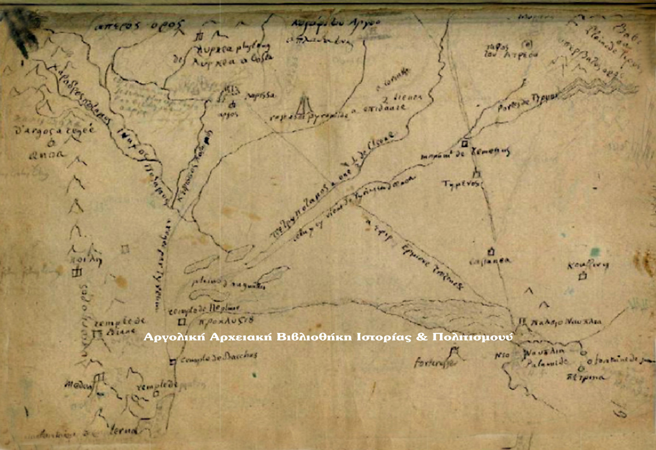 Η πεδιάδα του Άργους με καταγεγραμμένες τις πόλεις και τα χωριά. Ο Fourmont έψαχνε αρχαιότητες και ελληνικά χειρόγραφα για να τα μεταφέρει στη βιβλιοθήκη των ανακτόρων. Στο κέντρο τοποθετεί την πυραμίδα του Ελληνικού.