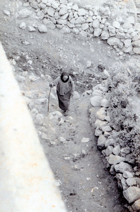 Πριν από τα αυτοκίνητα, οι δρόμοι του χωριού ήταν χωματόδρομοι πολυσύχναστοι όπου κυκλοφορούσαν οι κάτοικοι και τα ζώα τους. Στα πλαϊνά τους ήταν μαζεμένες πέτρες και πέτρινες υποτυπώδεις μάντρες ή μαντρότοιχοι. Εδώ κάτω από τον Άγιο Αθανάσιο η μεγάλη ανηφόρα, δύσκολη για τους ηλικιωμένους. Φωτογραφία από το Ιστορικό Αρχείο Αραχναίου. Λεζάντα: Μαρία Μπιμπή.