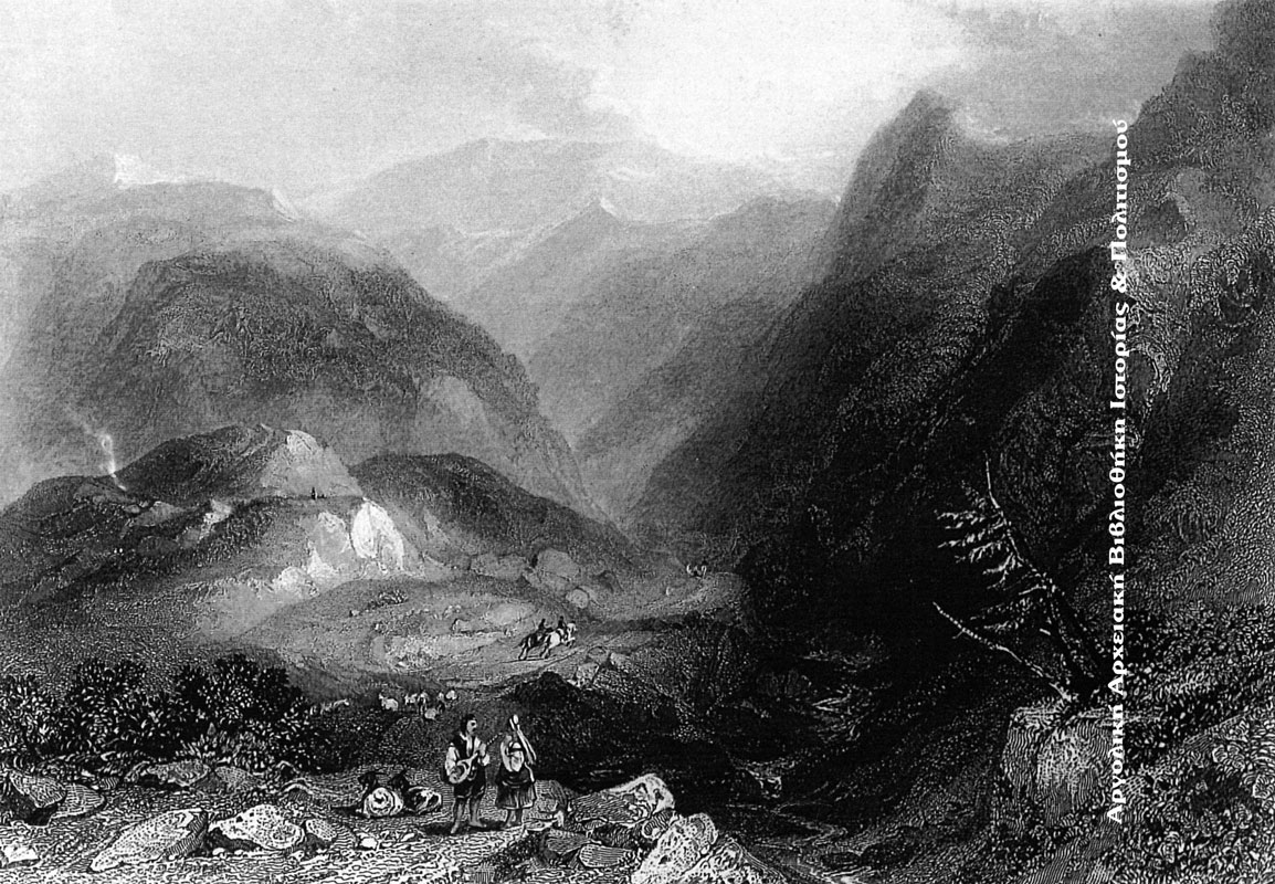 «Σκηνικόν στον δρόμον από Ναυπλίου προς Κόρινθον», J. B. Bentley από το βιβλίο του Christopher Wordsworth, Greece Pictorial, Descriptive and Historical. London 1844.