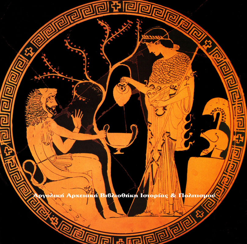 Για τον Ηρακλή, που η καταγωγή του ήταν από το Άργος, οι Έλληνες έπλασαν αναρίθμητους μύθους και εξύμνησαν τα κατορθώματά του. Είναι γνωστοί οι άθλοι του. Πάλεψε με άγρια θηρία, με φοβερούς και τρομερούς αντιπάλους, ακόμη και στον Άδη κατέβηκε και τιθάσευσε τον κέρβερο. Στην εικόνα, ο Ηρακλής που ξεκουράζεται από το πολύμοχθο έργο του κάτω από τον ίσκιο μιας ελιάς, δέχεται την Αθηνά που του προσφέρει κρασί για να τον δροσίσει. Εσωτερικό ερυθρόμορφης κύλικας. Γύρω στο 470 π.Χ. Μόναχο,