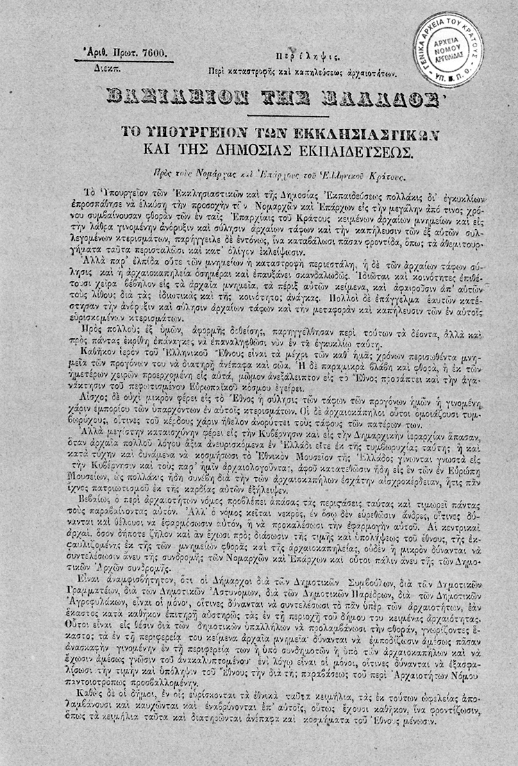 Η προστασία των αρχαιοτήτων της Αργολίδας κατά τον 19ο αιώνα: Τεκμήρια από το Αρχείο του Δήμου Ναυπλιέων » Εγκύκλιος