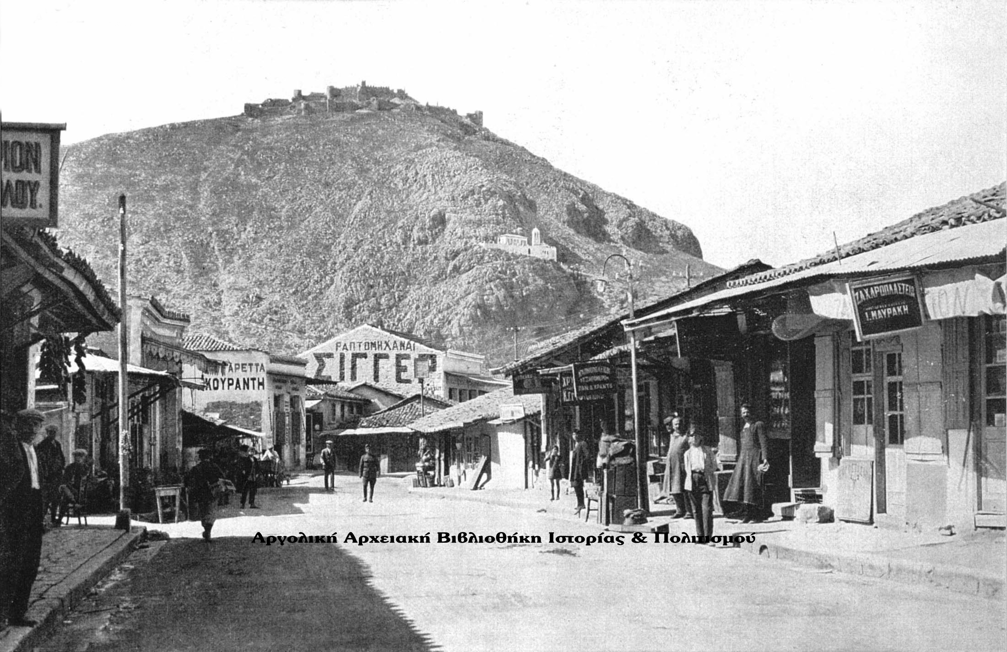 Άργος. Η οδός Βασ. Κωνσταντίνου (1930;). Στο βάθος διακρίνεται το κάστρο της Λάρισας και η Παναγία η Κατακεκρυμμένη.