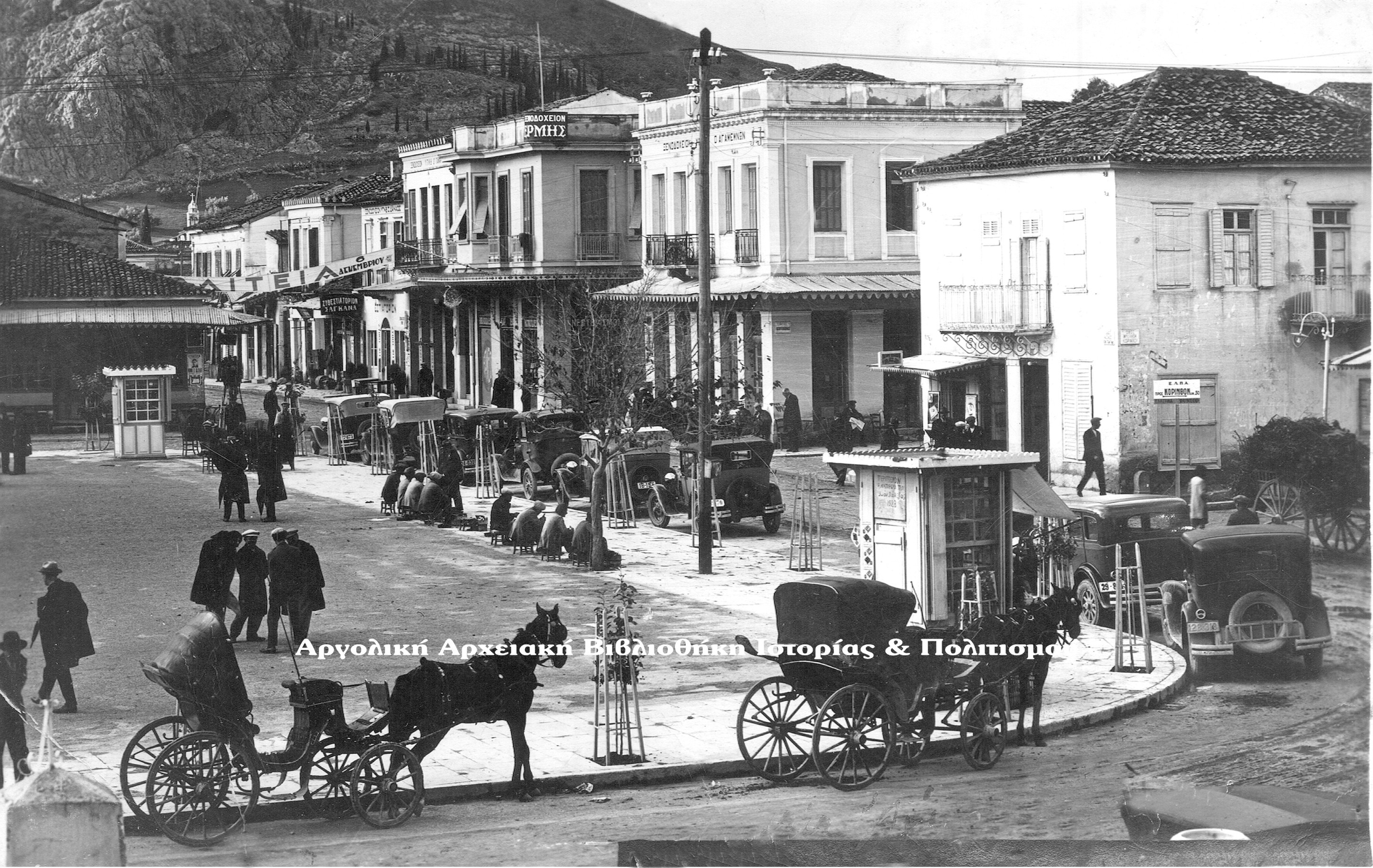 Το πρώτο κτίριο δεξιά κατεδαφίστηκε και παραχώρησε τη θέση του σε πολυκατοικία. Το επόμενο κτίσμα ήταν το ξενοδοχείο «Αγαμέμνων». Αριστερά της οδού, το πρώτο κτίσμα ήταν το γραφικό «Γιαλί Καφενέ», που κατεδαφίστηκε το 1958, για να παραχωρήσει τη θέση του σε άλλη μία πολυκατοικία. (Φώτο του 1939;).