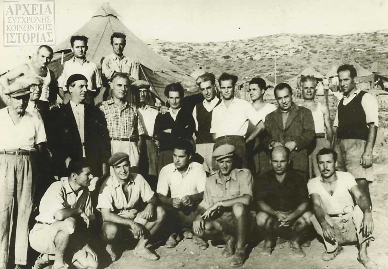 Οι Μάνος Κατράκης, Τ. Καρούσος, Γιάννης Ιμβριώτης, Μενέλαος Λουντέμης, Δημήτρης Φωτιάδης, Νίκος Παπαπερικλής στη Μακρόνησο, 1949 (ΑΣΚΙ/Φωτογραφικό Αρχείο Νίκου Μάργαρη).