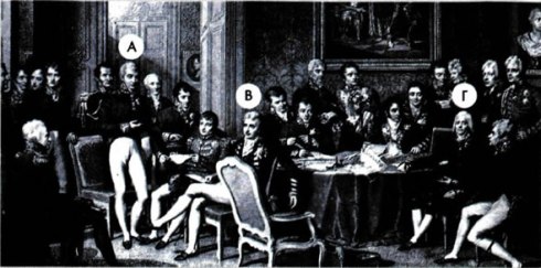 «Συνέδριο της Βιέννης (1814-1815)». Οι εκπρόσωποι των ευρωπαϊκών κρατών διαπραγματεύονται στο Συνέδριο της Βιέννης. Α. Ο Αυστριακός καγκελάριος Μέτερνιχ. Β. Ο υπουργός Εξωτερικών της Μ. Βρετανίας κόμης Κάσλρι. Γ. Ο υπουργός Εξωτερικών της Γαλλίας Ταλεϋράνδος.